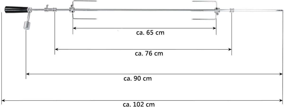 Spit zelf is maar liefst 90 cm lang. Spit én vleesvorken zijn gemaakt van RVS (304 grade). Sommige concurrenten maken gebruik van verchroomd staal maar dat is minder veilig omdat chroomdeeltjes in het voedsel terecht kunnen komen.