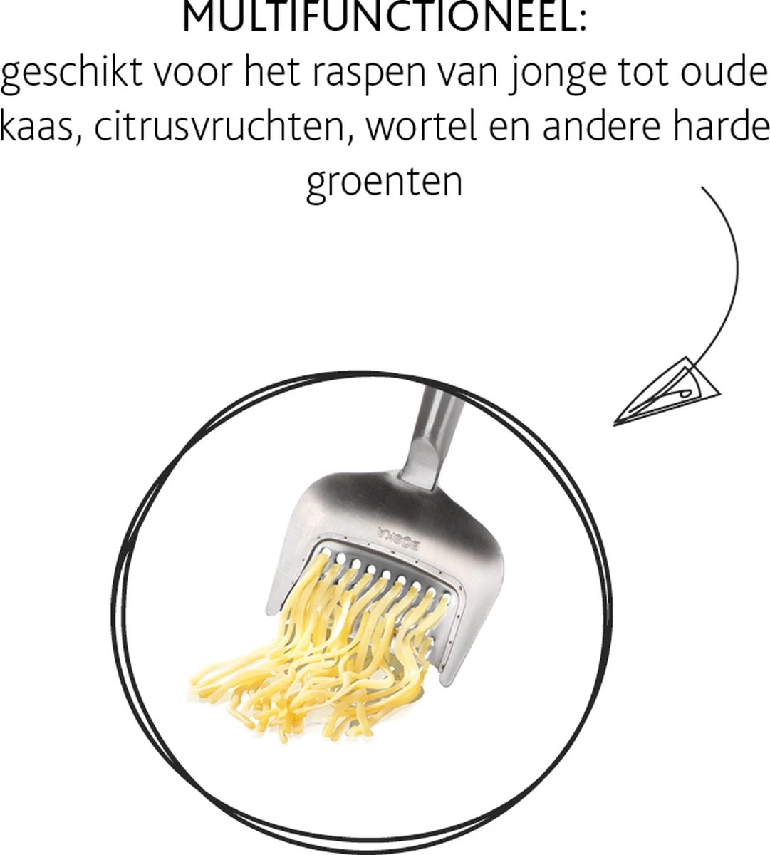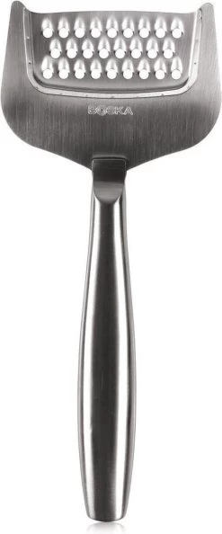 Echte fijnproevers kunnen het beamen: versgeraspte kaas is veel smaakvoller dan de voorverpakte variant. Dus geniet nu nog meer van je favoriete kaas door het zelf te raspen met deze stijlvolle en functionele rasp. Het handvat is hol van binnen, wat de rasp licht van gewicht maakt.
