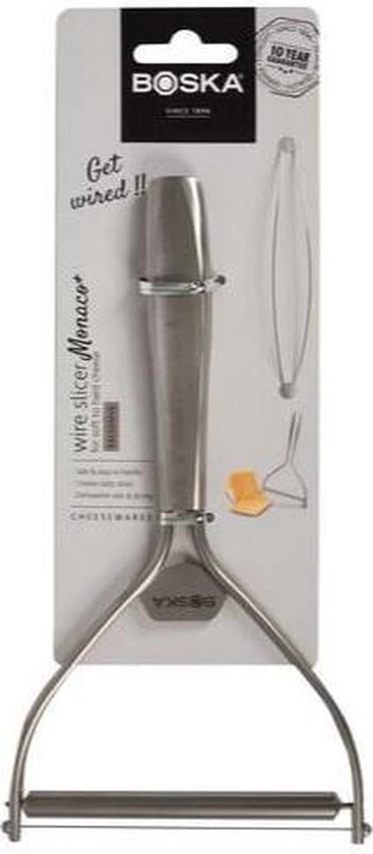 Met de BOSKA Kaasschaaf met Snijdraad Monaco+ schaaf je op een veilige manier. Deze roestvrijstalen schaaf heeft een vervangbaar snijdraad dat sterk genoeg is voor jonge kaas zonder korst, maar je vingers niet zal snijden als je uitschiet. Verstelbaar in twee plakdiktes en vaatwasserbestendig.