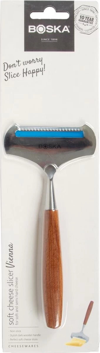 Met de Kaasschaaf Zacht Vienna van BOSKA maak je zeer eenvoudig de lekkerste plakken jonge kaas. Door het korte schaafblad blijft de kaas namelijk niet kleven en krult het niet op. Zo glij je soepel met deze schaaf met gerookt beukenhouten handvat door elke zachte en half harde kaas heen.