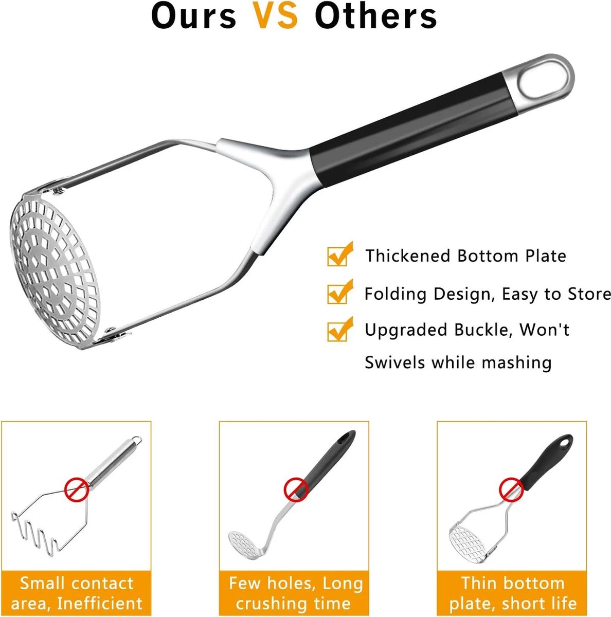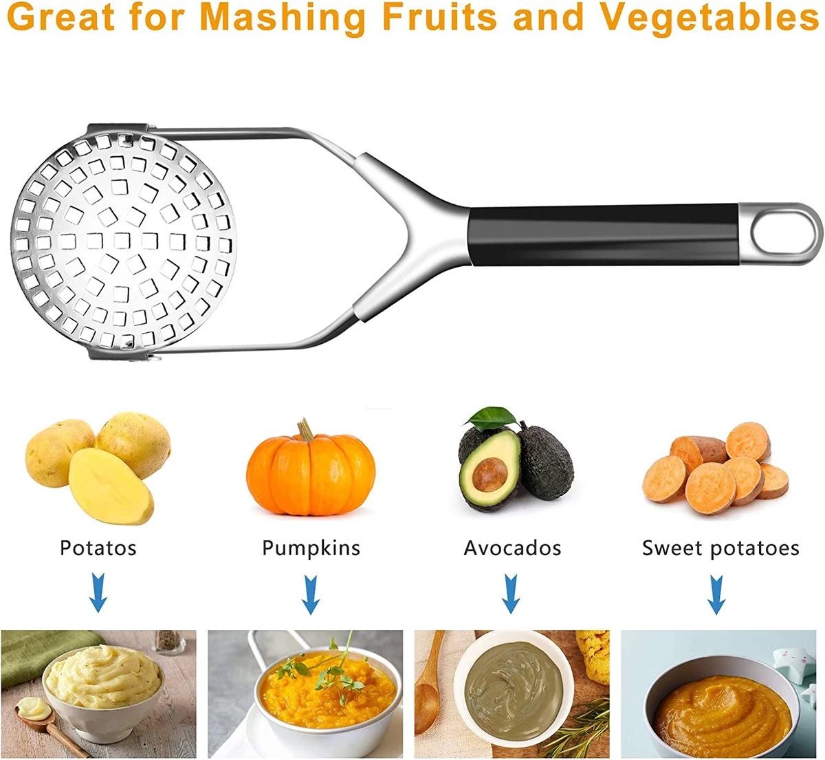 De handmatige aardappelstamper is perfect en gemakkelijk voor fruit en allerlei culinaire bereidingen op basis van groenten, zoals yams, bananen, wortels, peren, appels, zelfgemaakte babyvoeding. Onze stamper wordt zelfs gebruikt voor jam