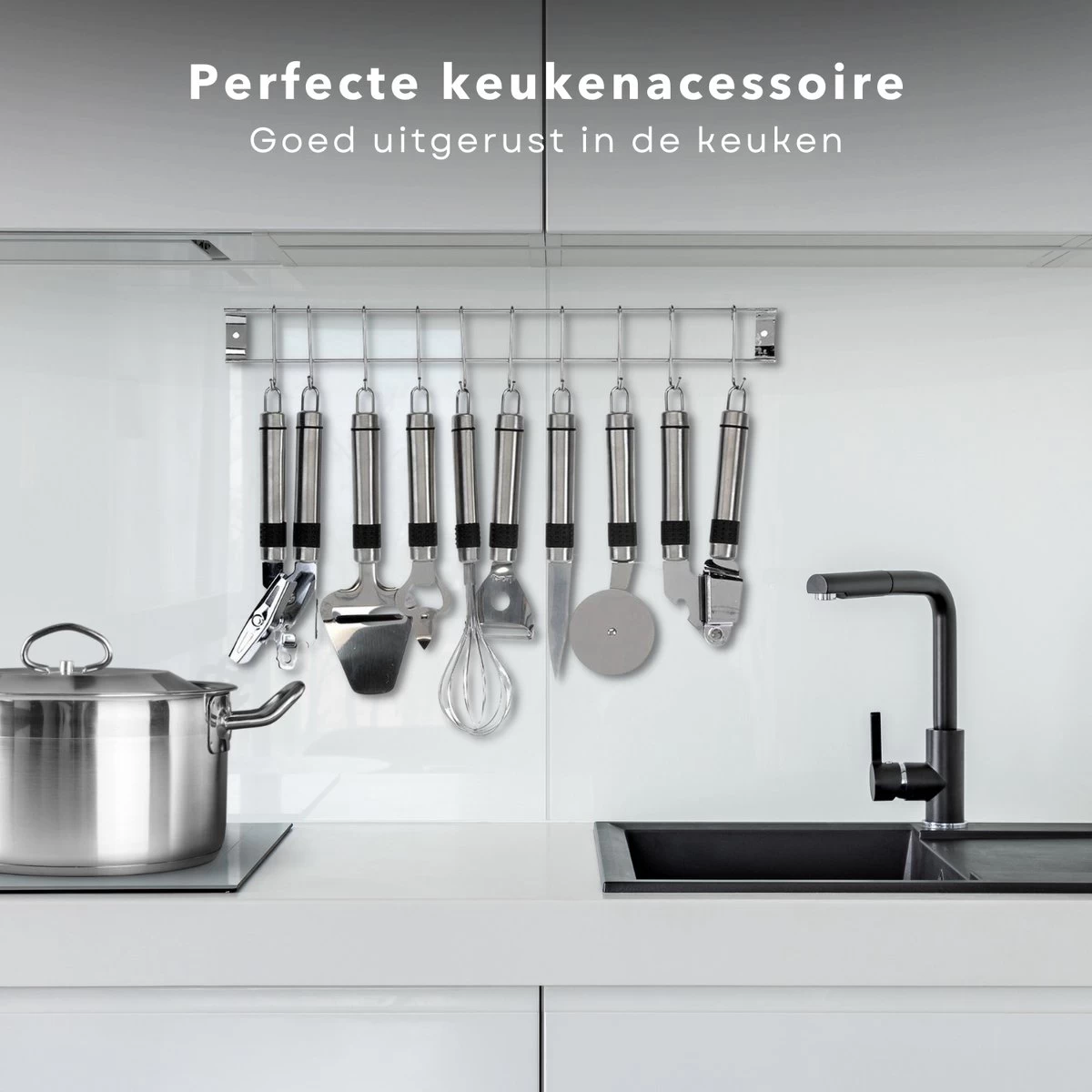 Deze 9-delige roestvrijstalen keukenset van Cheqo is alles wat je nodig hebt om maaltijden te maken als een pro. Het ophangrek met haken zorgt ervoor dat al je keukengerei binnen handbereik is, terwijl de 8 meegeleverde keukengereedschappen al je bases dekken. Met een blikopener, kaasschaaf, flesopener, garde, dunschiller, pizzaroller en knoflookpers bent u op elk gerecht voorbereid. Bovendien is de roestvrijstalen constructie niet alleen duurzaam, maar ziet het er ook geweldig uit in elke keuken.