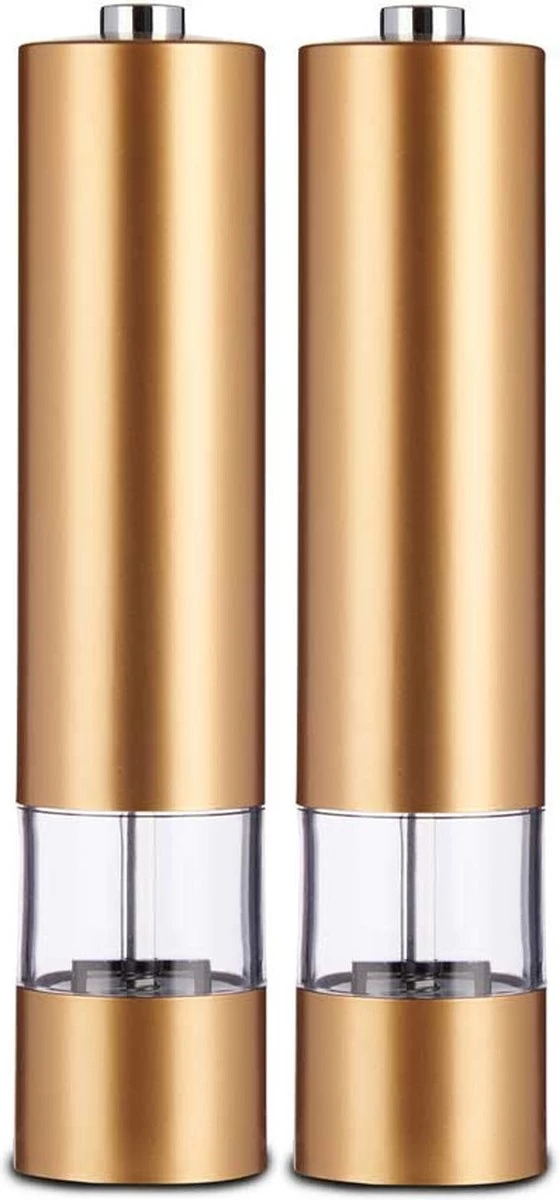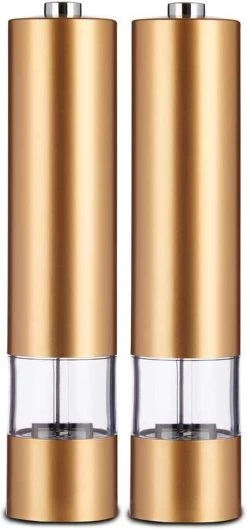 Kinvara Elektrische zout/pepermolen 2 stuks LED kunststof goud 23 cm. Elektrische zout/pepermolen, geschikt voor het malen van diverse kruiden/specerijen, peper en zout. Niet geschikt voor in de vaatwasser. Afmeting: 6 x 6 x 23,5 cm. Kleur: goud. materiaal: kunststof.