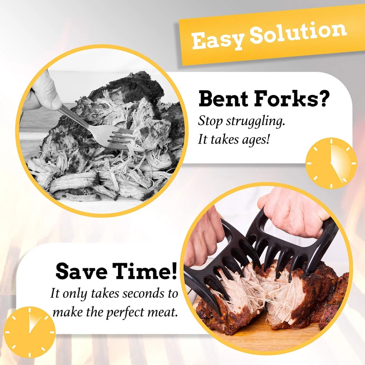 Geen verbrande vingers meer bij het bereiden van vlees – Geen taak is te groot voor onze vleesklauwen. Verplaats en hak uw gegrild vlees zonder uw vingers te branden aan het hete gegrilde voedsel. Nu op NIEUWE & VERBETERDE roestvrijstalen varkensklauwen.