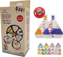 Dit product bestaat uit 2 driehoekige onigiri sushi vormen: 1 medium en 1 groot – met afsluitdeksel en 1 Lepel