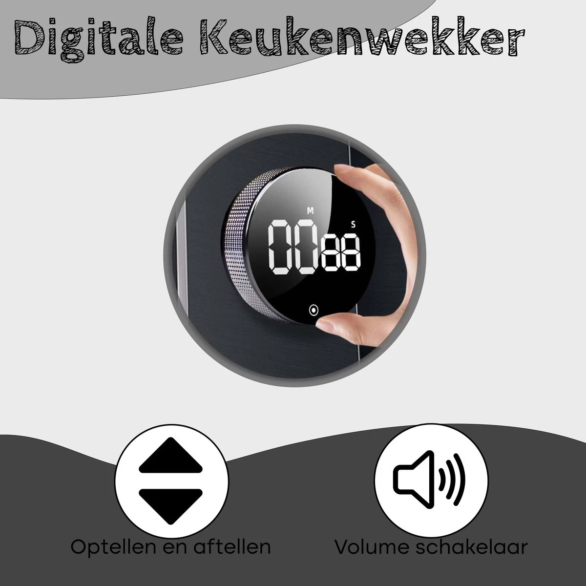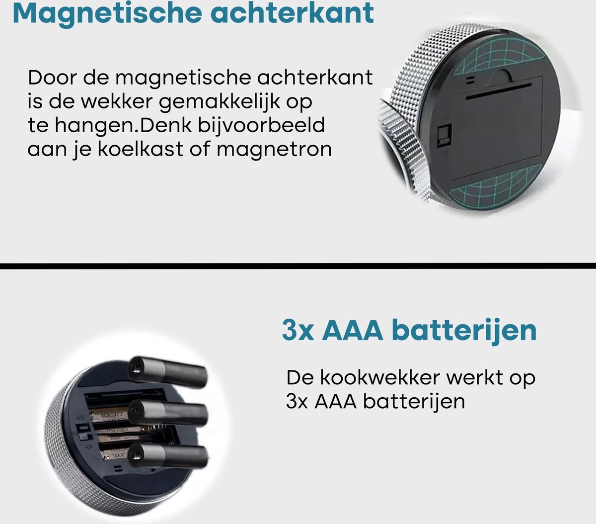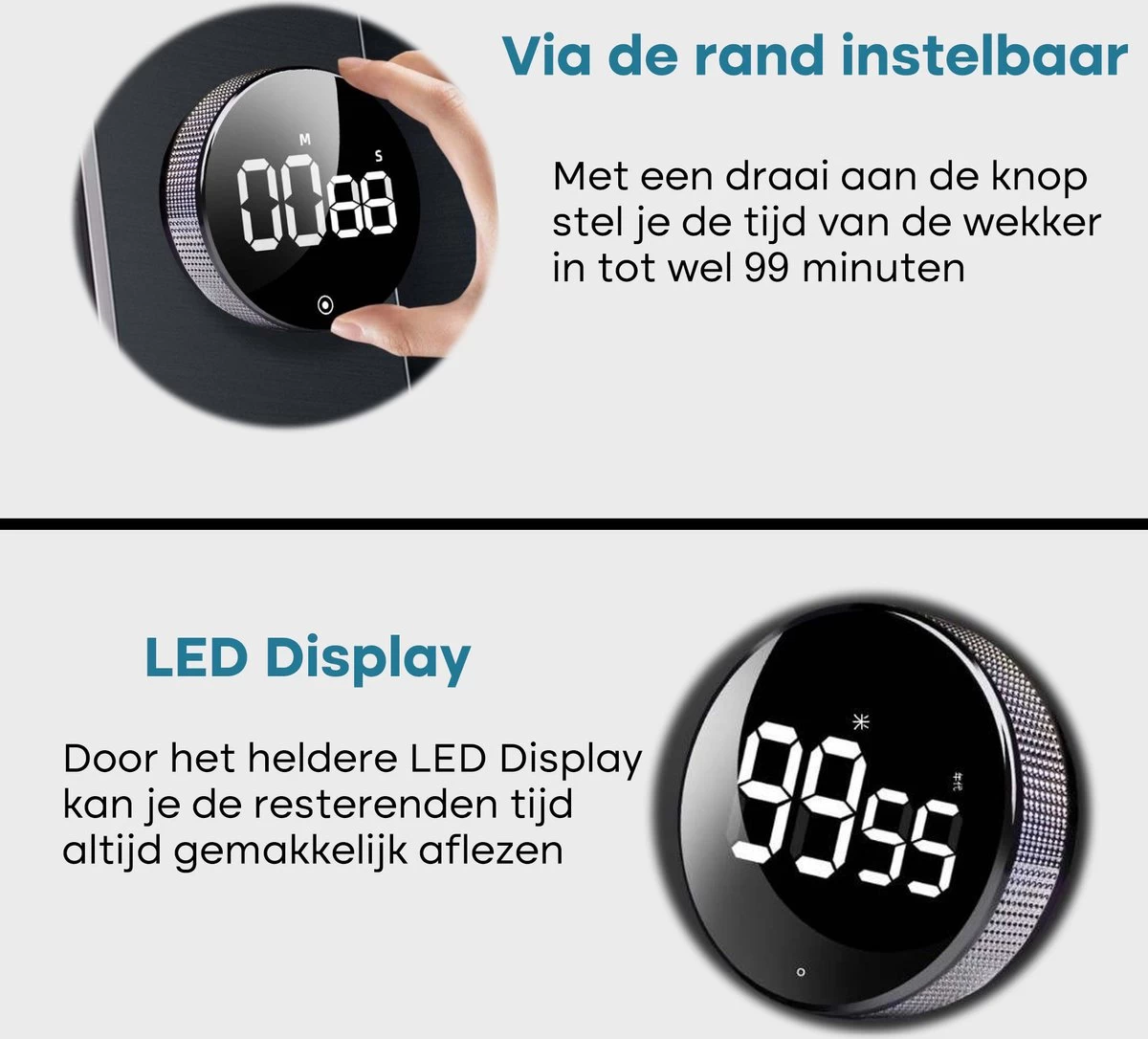 De LED-display is gemakkelijk af te lezen en heeft een smart timer-functie waarmee u meerdere timers tegelijk kunt instellen. U kunt de tijd optellen of aftellen en de wekker kan worden ingesteld van 1 seconden tot 99 minuten en 59 seconden.