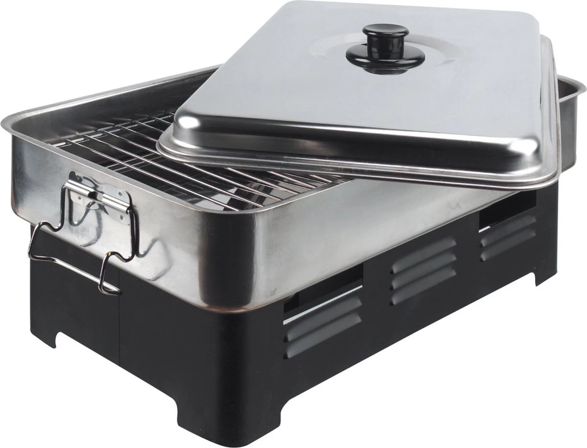 Voor het zelf roken van bijzondere lekkernijen, zoals vlees en vis, is deze rookoven ‘De Luxe’ van Kitchen Basics onmisbaar. Het roken geeft het vlees of vis een bijzondere, subtiele rooksmaak en zorgt voor conservering. De rookoven heeft een grillrooster en 2 branders, en zowel de ventilatie als de branders zijn nauwkeurig regelbaar. Deze rookoven is gemaakt van roestvrij staal en werkt op spiritus, die in de bijgeleverde branders gegoten dient te worden. Een gebruiksaanwijzing is inclusief. Dankzij het compacte formaat is de rookoven ook handig op de camping.