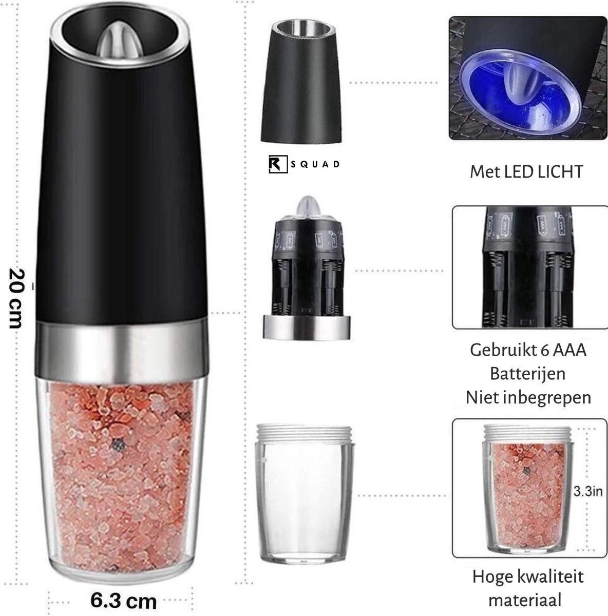 De Peper & Zoutmolen werkt met een zwaartekracht sensor. Je hoeft hem alleen om te draaien om automatisch gebruik te maken van je peper, zout of andere korrelkruid. De peper- en zoutmolen werkt op 6 AAA-batterijen (niet meegeleverd).