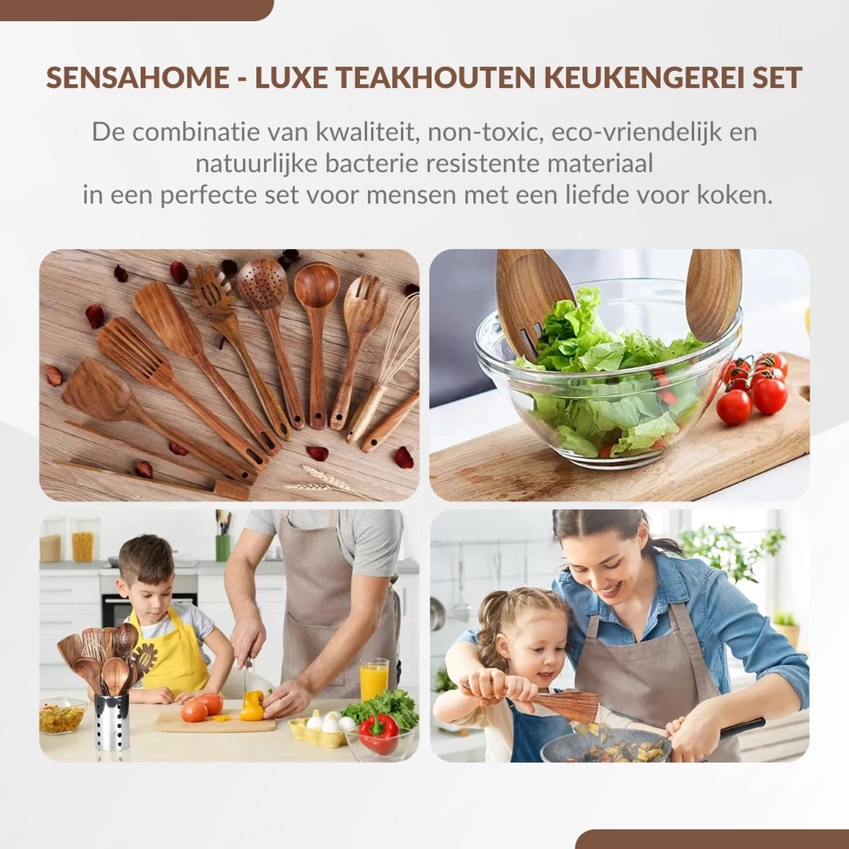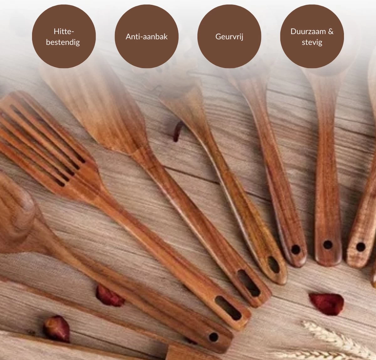 De keukengerei set is gemaakt van BPA-vrij teakhout, geurvrij en duurzaam en mooi. zo blijven je gerechten vrij van schadelijke onzuiverheden zet je in een mum van tijd veilige en gezonde maaltijden op tafel. Daarnaast krast het teakhouten oppervlak van het keukengerei niet in pannen of potten waardoor er geen schadelijk teflon (anti-aanbaklaag) vrij komt en in je voedsel terechtkomt.