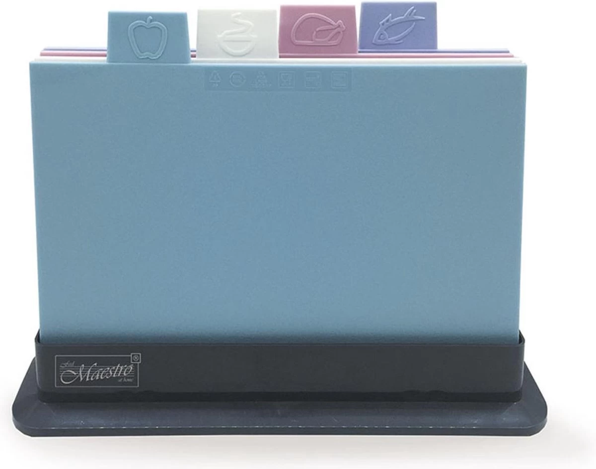 Set van vier rechthoekige dubbelzijdige borden voor diverse soorten producten. Hierdoor wordt voorkomen dat het gesneden voedsel de smaak van andere voedingsproducten overneemt.