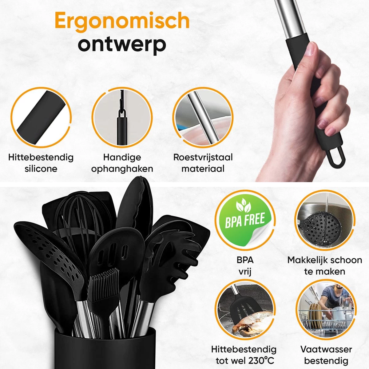 Gek op koken maar mis je de juiste spullen? Deze 43-delige keukengerei set heeft alles wat je nodig hebt! Met hoogwaardig materiaal, een bijgeleverde houder en stijlvol ontwerp transformeer jij jouw keuken met slechts één set. Koken, grillen of toch liever bakken? Deze siliconen set kan écht alles. Lepels, tangen, maatbekers & de fijnste spatels. Dit veelzijdige pakket heeft het allemaal!