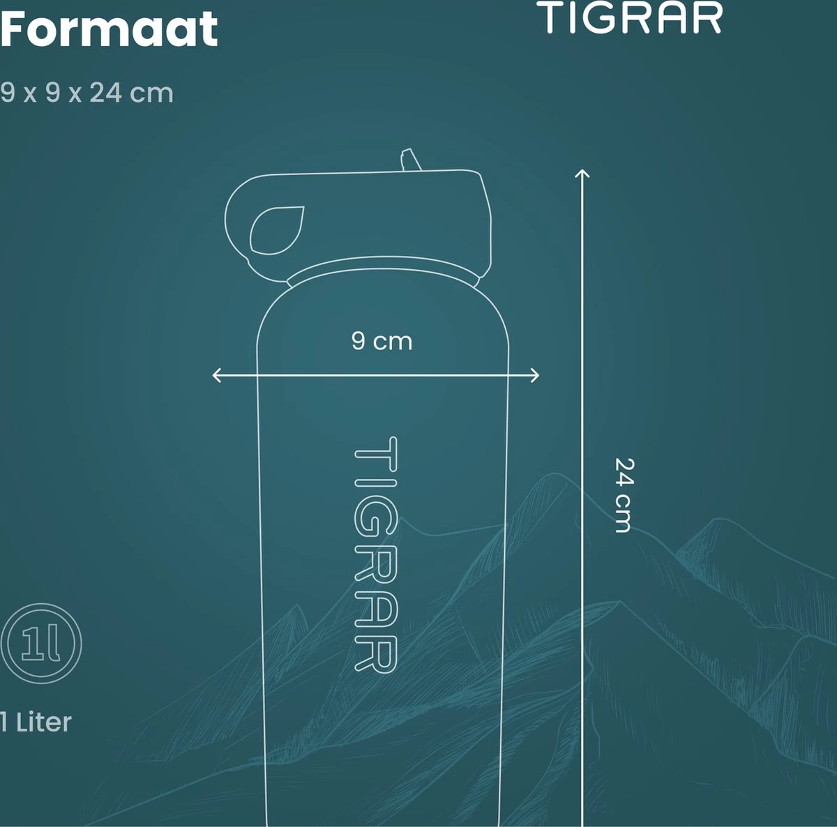 - Afmetingen: 9 cm x 9 cm x 24 cm (inclusief dop op de drinkfles)