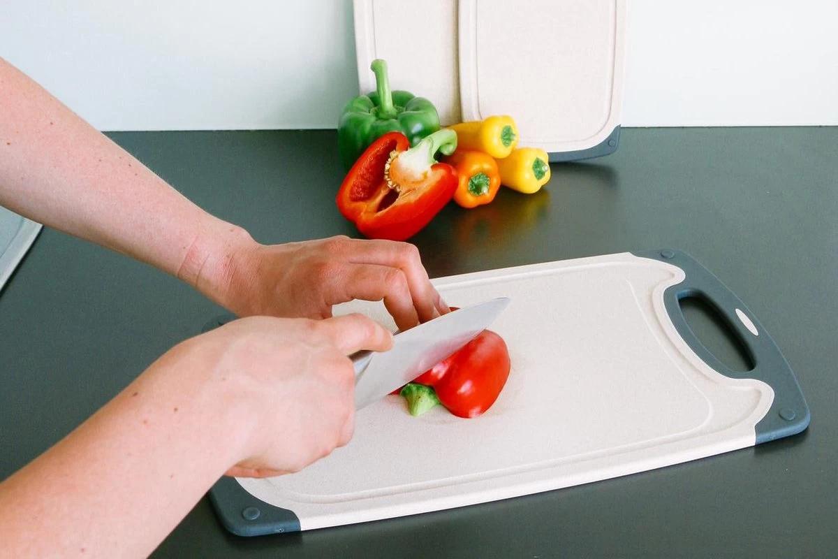 Maak gebruik van beide kanten van de snijplank. Aan de ene kant de groeven om het sap tegen te houden en aan de andere kant een compleet egaal oppervlak.