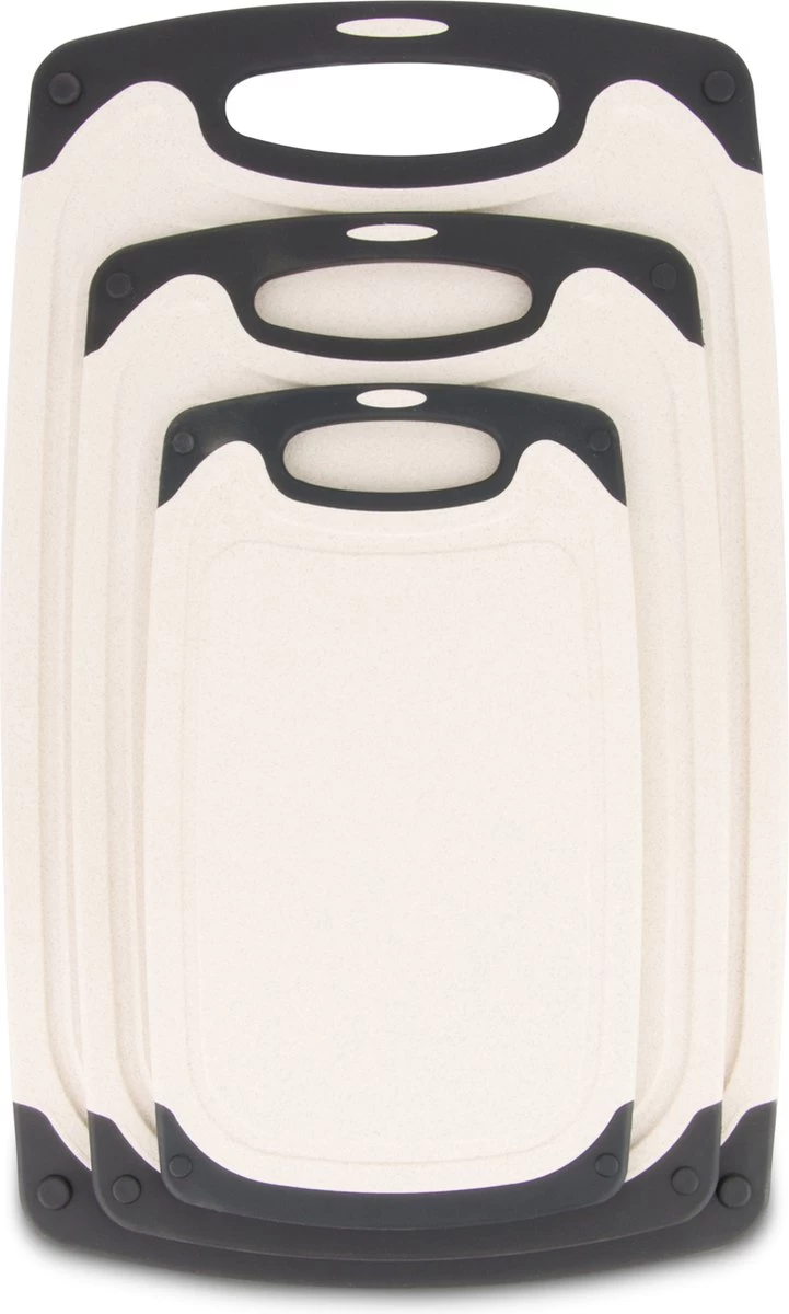 De snijplanken zijn gedeeltelijk gemaakt van biologisch afbreekbare tarwestro vezels, waardoor deze set snijplanken een duurzame keuze is.Onze plastic snijplanken zijn BPA vrij en veilig voor in de vaatwasser. Bovendien zijn ze niet poreus, waardoor de vloeistoffen niet in de snijplank blijven zitten. Dit is bijvoorbeeld wel het geval bij een bamboe of houten snijplank.